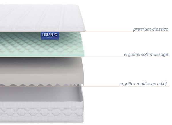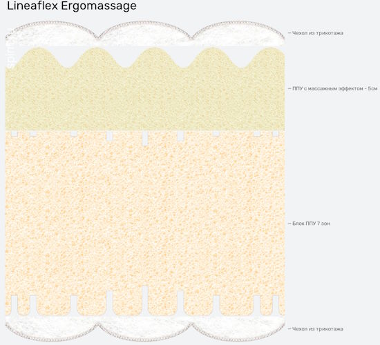 Хит продаж – ортопедический матрас (от «Линия Флекс») Эргомассаж – настоящий прорыв в мире комфортного отдыха. Высота составляет 19 см. Беспружинный блок разделен на две части: верхний слой HARD-massage обеспечивает упругость класса «жесткий» и нижний – высокоэластичная пена на водной основе ERGOFLEX-onda, гарантирующая превосходную циркуляцию воздуха. Вы можете в любой момент поменять уровень комфорта, для этого стоит, всего лишь, перевернуть матрас.
