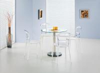 Стеклянный стол Cyryl – компактный обеденный стол польской компании Halmar с круглой столешницей из прозрачного закаленного стекла и подставкой из мрамора. Опора из хромированной стали.